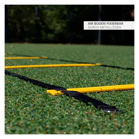 Die Koordinationsleiter kann schnell aus- und eingerollt werden. Zusammengerollt kann die Leiter platzsparend verstaut werden. Mit einer Breite von 50 cm und einer maximalen Länge von 400 cm können Sie so eine effektive Koordinationsstrecke aufbauen. Die insgesamt 8 Sprossen können verschoben werden, so dass Sie die Tritträume variieren können. Metallösen an den Enden ermöglichen das Fixieren im Boden.