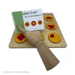 Das Formlegespiel GeoLeo ermöglicht verschiedene geometrische Formen in runde Scheiben zu unterschiedlichen Anordnungen zu legen.
