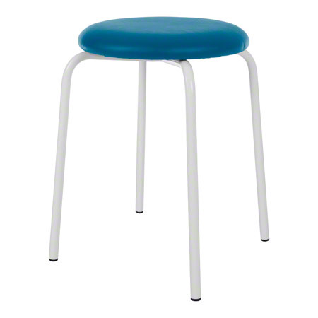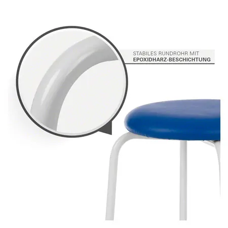 Die bequeme Sitzfläche ist gepolstert und mit Kunstleder überzogen, wodurch sie sich problemlos abwaschen lässt. Dabei weist das Polster eine etwas geringere Stärke auf als das Komfort-Polster. Dank des Gestells aus stabilem Rundrohr mit Epoxidharz-Beschichtung ist der Hocker bis 120 kg belastbar.