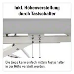 Die elektrische Höhenverstellung ohne horizontalen Versatz erfolgt mittels, beidseitig am Polster befestigter, Schaltleiste und ist stufenlos zu regulieren von 46-89 cm. Dieser Aspekt bietet zusätzlichen Therapiekomfort und stellt neben den 2 Rädern, mit rutschfester Lauffläche, das i Tüpfelchen dieser Therapieliege dar.