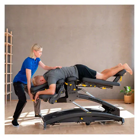 Patient:innen können sanft und geräuschlos in die gewünschten therapeutischen und anatomischen Lagerungspositionen gebracht werden. Mobilisationen können 3- Dimensional ausgeführt werden, durch Nutzung der Traktion, Flexion, Lateralflexion und Rotation unter Zuhilfenahme der Gravitation. Das Design der Liege mit dem Zwei-Motoren-Antrieb sowie Lagern an allen beweglichen Teilen verbessert die Ergonomie der therapeutischen Arbeit, macht diese weniger belastend und bewirkt bessere Therapieergebnisse.