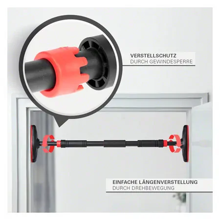 Die Enden der Klimmzugstange haben eine extra große Fläche und sind mit rutschfestem Material versehen. Dies gibt sicheren Halt und verhindert ein Abrutschen der Stange am Türrahmen. Die Gewinde zum Spannen der Stange können durch Gewindesperren gesichert werden, so dass sich die Stange während des Trainings nicht löst. Gepolsterte Griffflächen bieten einen sicheren und angenehmen Griff, auch bei schweißnassen Händen.